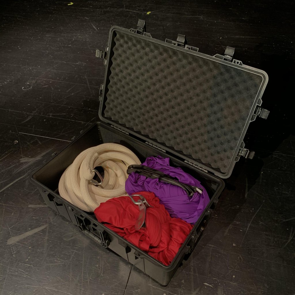 Naplnený kufor na fotografii je veľkosti L na dne 1x trapéz, 2x šál 8m vr. závesného valca a 1x Lano 7m dlhé, a iste by sa tam zmestilo ešte dosť doplnkového sortimentu.
